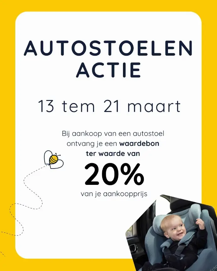 Bij aankoop van een autostoel of autostoelbasis ontvang je een waardebon ter waarde van 20% van het aankoopbedrag. Dit doe je door de bon die op onze home-pagina staat toe te voegen aan je winkelmandje.