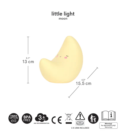 Super schattig maan lampje! Geeft een mooie, zachte gloed in het donker. Dit vrolijke lampje is gemaakt van BPA-, en loodvrij PVC. Doordat er een LED-lamp in zit wordt het materiaal niet heet en kan het veilig door kinderen gebruikt worden.