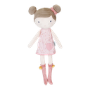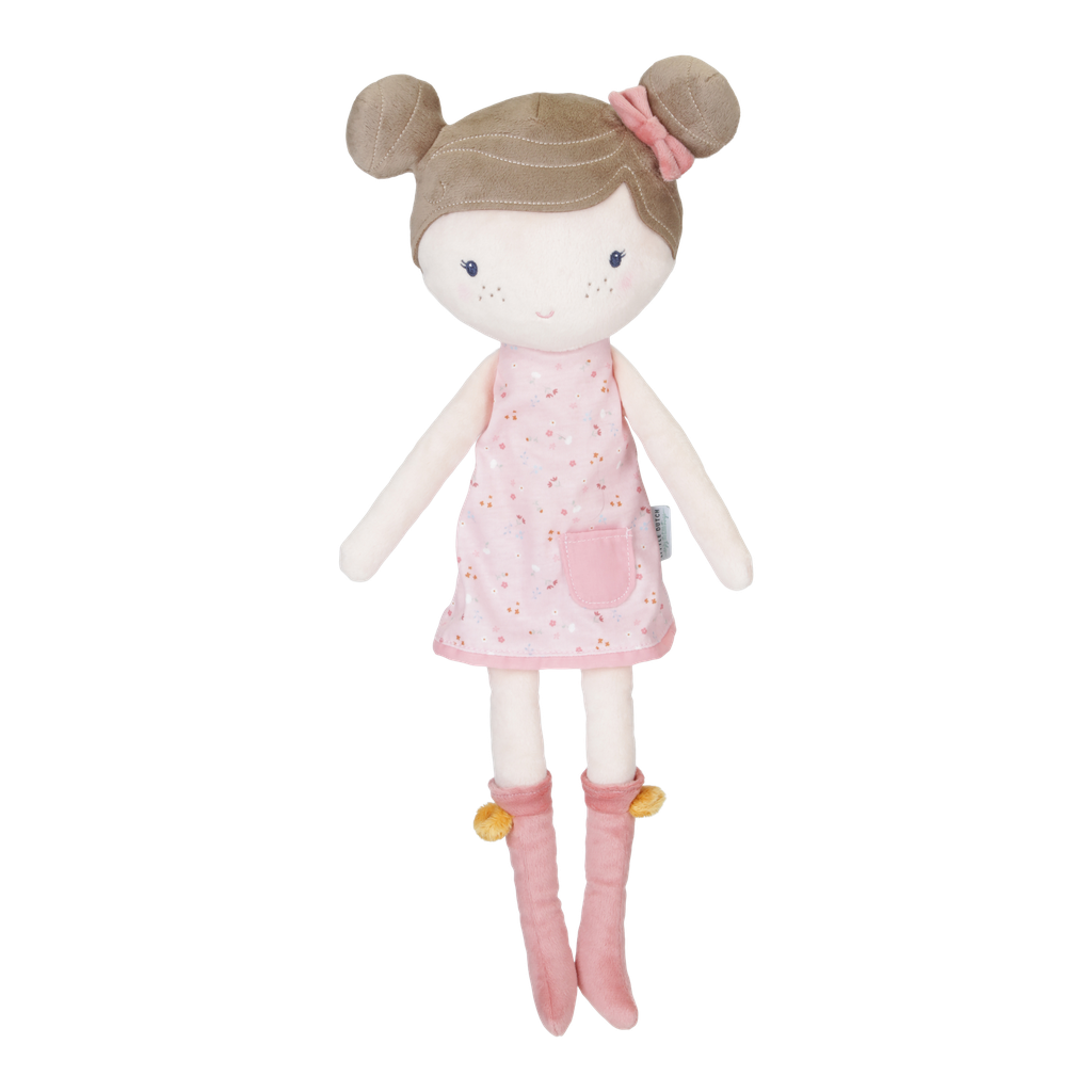 Dit is lieve Rosa. Deze pluche knuffelpop van Little Dutch in een schattig jurkje wil graag geknuffeld worden. Rosa kan rechtop blijven zitten en rijdt graag met je mee in de houten poppenbuggy van Little Dutch.