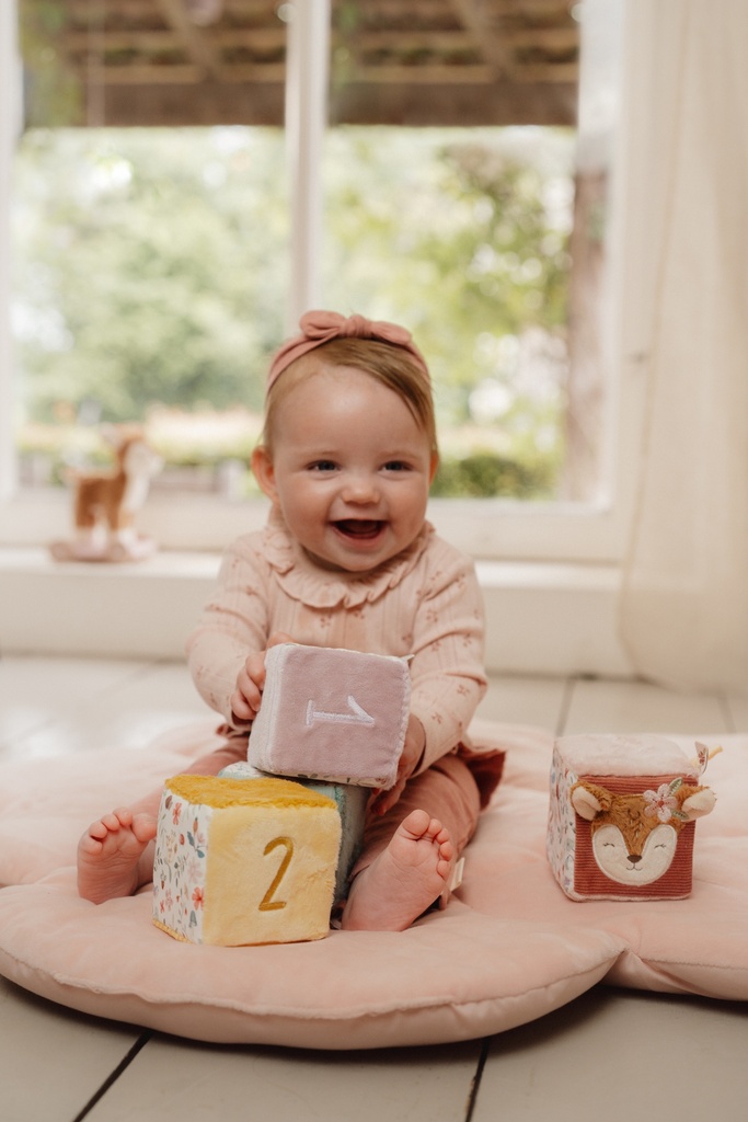 Elke blok heeft zijn eigen zachte kleur, uniek nummer en verrassende details: labels om aan te friemelen, pluche panelen om te ontdekken en een bloemig spiegeltje voor eindeloos kijkplezier. Terwijl je baby speelt, wordt de hand-oogcoördinatie spelenderwijs ontwikkeld.