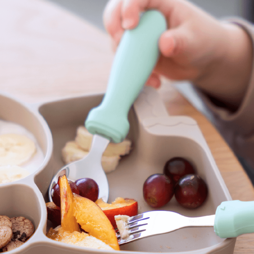 - Ergonomische grip: Elk stuk is voorzien van een siliconen handvat, perfect gevormd voor de kleine kinderhandjes, wat zorgt voor een slipvrije grip tijdens het eten.