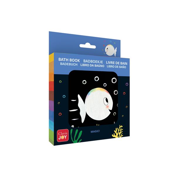 Een magisch badboekje van Klein wit visje om mee te spelen in het water. Wanneer je het boekje onderdompelt, komen de kleuren tevoorschijn.